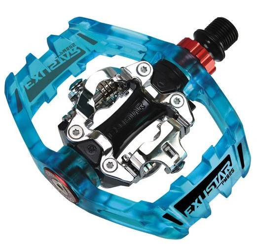 Sturdy Exustar foot pedals with tilting cage and SPD double-acting mechanism.