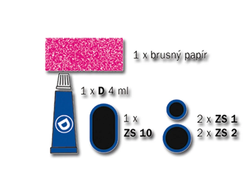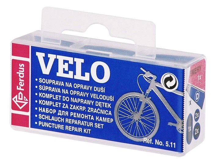 Universal set of glues for repairing bicycle inner tubes. Contains glue, 5 patches of various sizes, sandpaper and instructions in a practical box.