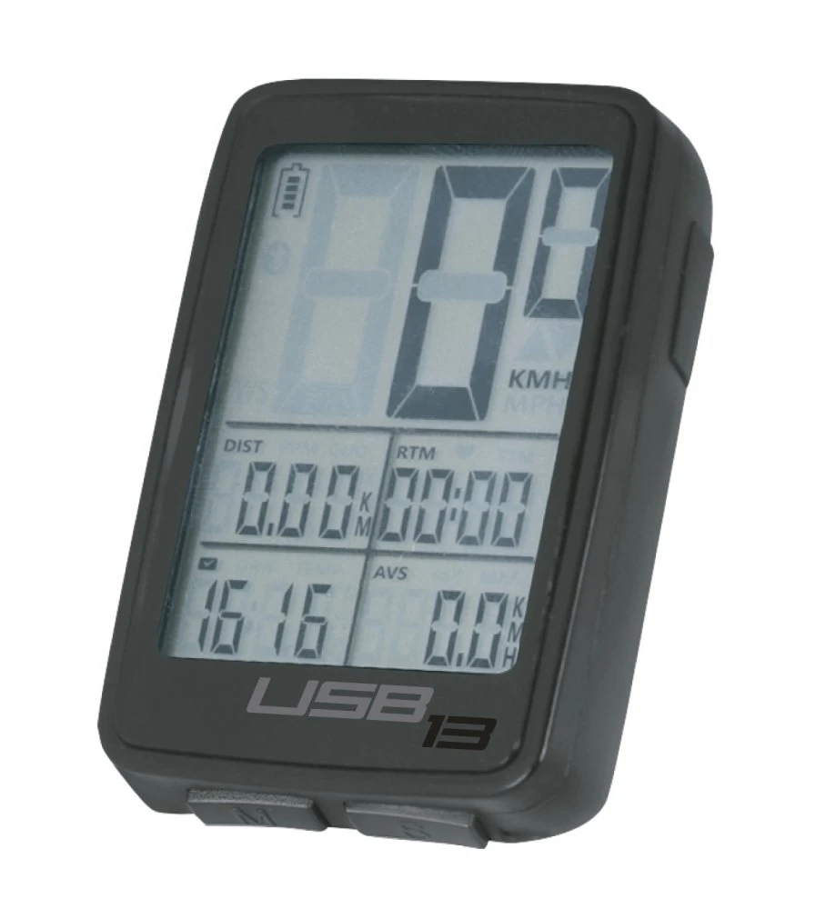 Bezdrátový počítač na kolo s 13 funkcemi a nabíjením přes USB.