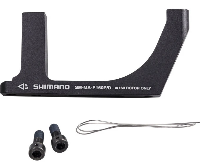 Shimano front adapter for mounting Post mount bracket (74mm pitch) to Flat mount fork mount (34mm pitch) with 160mm blade.