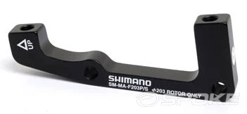 Shimano adapter for mounting a PM (74mm) caliper on an IS (51mm) fork with a 203mm disc.